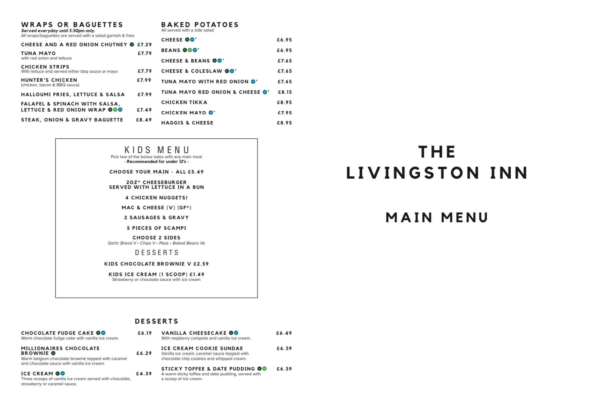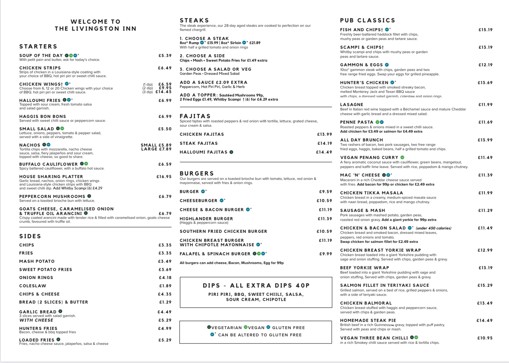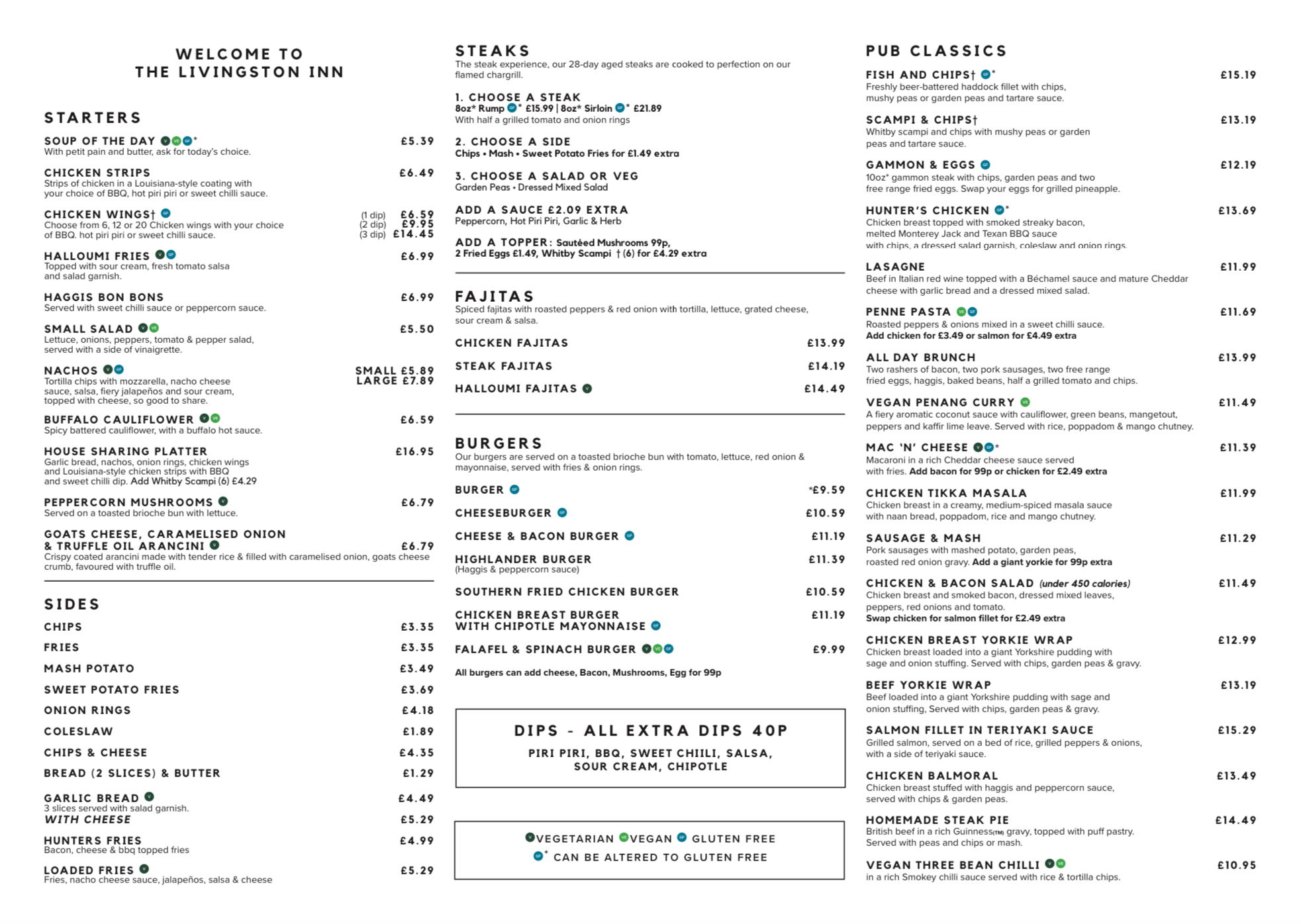 At the Livingston Inn, we aim to offer a diversity of Modern British Cuisine with Traditional Pub Classics and an extensive Grill menu to show case some excellent produce provided by our trusted butchers and proven suppliers. We only source the very best of which is mostly British, seasonal and fresh.